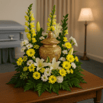 Arrangement floral funéraire pour urne, réalisé dans des teintes de blanc et de jaune